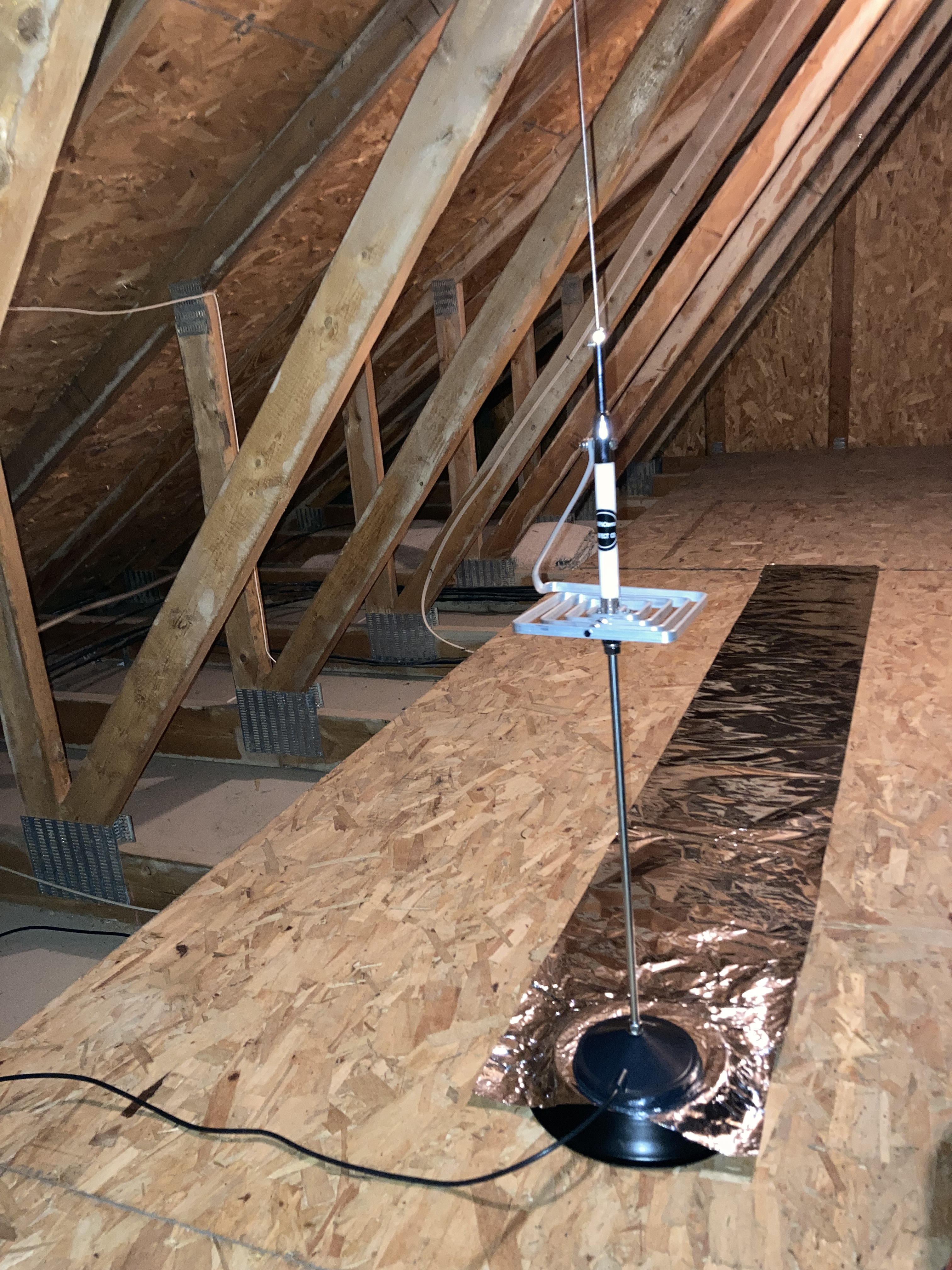 Although outdoor installation is recommended to reduce RF noise from indoor switching power supplies, etc., users report success with installations such as in this photo where about 8′ of standard aluminum foil is at its end sandwiched between a (Hustler brand) magnet mount above and a steel plate/cookie sheet/pan below: